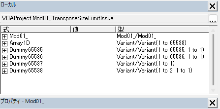 WorksheetFunction.Transpose関数は、配列の要素数が65,536以下であれば正常に動作しますが、65,537以上になると挙動が不安定になり、想定外の結果を返す場合があります。サンプルコードの実行結果でローカルウィンドウの中身を基にした詳細な説明です。